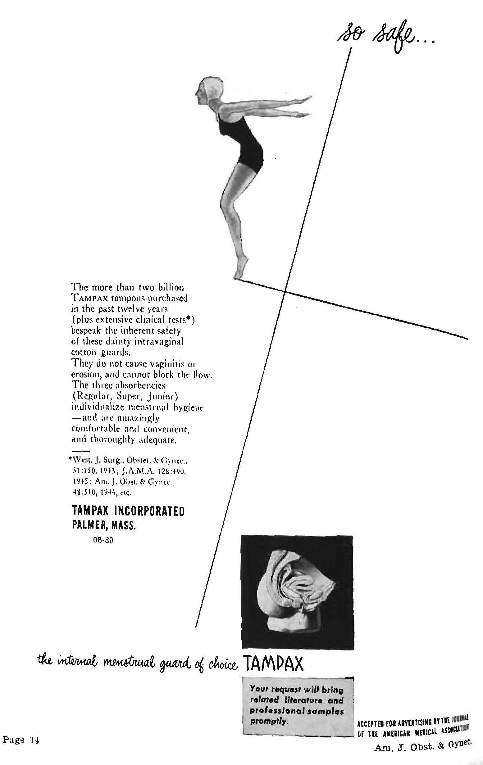 1950: There’s a long history of women swimming in tampon ads. And there’s an “inherent safety of these dainty intravaginal cotton guards.”