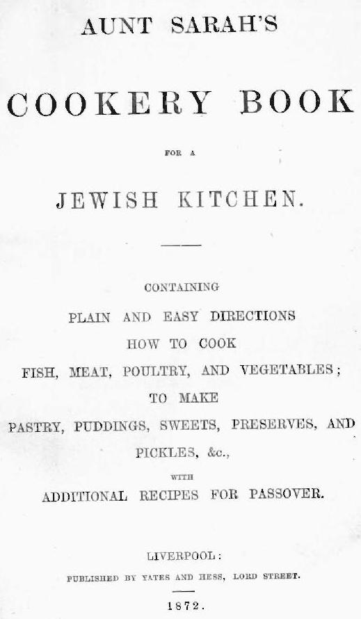 3. Aunt Sarah. (1872). Aunt Sarah’s cookery book for a Jewish kitchen: Containing plain and easy directions. How to cook fish, meat, poultry, and vegetables; to make pastry, puddings, sweets, preserves, and pickles, &c., with additional recipes for Passover. Liverpool: Yates and Hess.