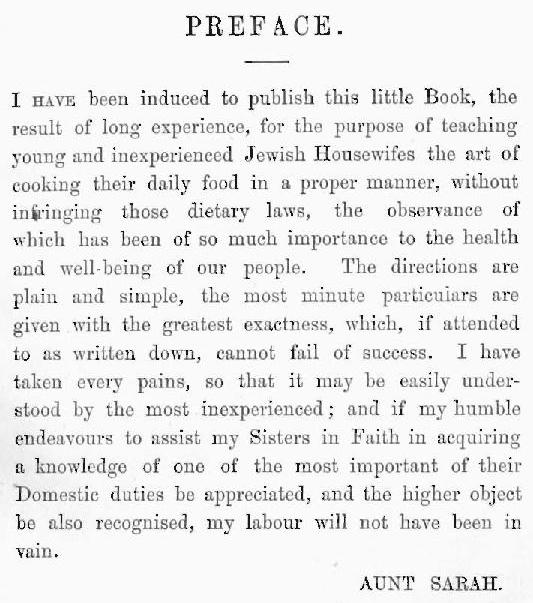 “I have been induced to publish this little Book, the result of long experience, for the purpose of teaching young and inexperienced Jewish Housewifes the art of cooking their daily food in a proper manner, without infringing those dietary laws, the observance of which has been of so much importance to the health and well-being of our people. The directions are plain and simple, the most minute particulars are given with the greatest exactness, which, if attended to as written down, cannot fail of success. I have taken every pains, so that it may be easily understood by the most inexperienced; and if my humble endeavors to assist my Sisters in Faith in acquiring a knowledge of one of the most important of their Domestic duties be appreciated, and the higher object be also recognized, my labour will not have been in vain.