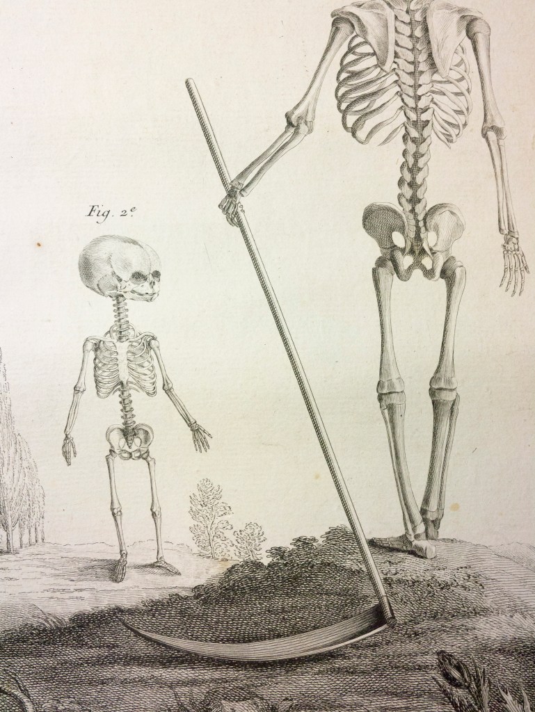 Monro3 Published October 4, 2013 at 2307 × 3072 in Winsome Fetal Skeletons Bearing Scythes: Monro’s Traité d’ostéologie of 1759: Guest post by Morbid Anatomy Monro 3