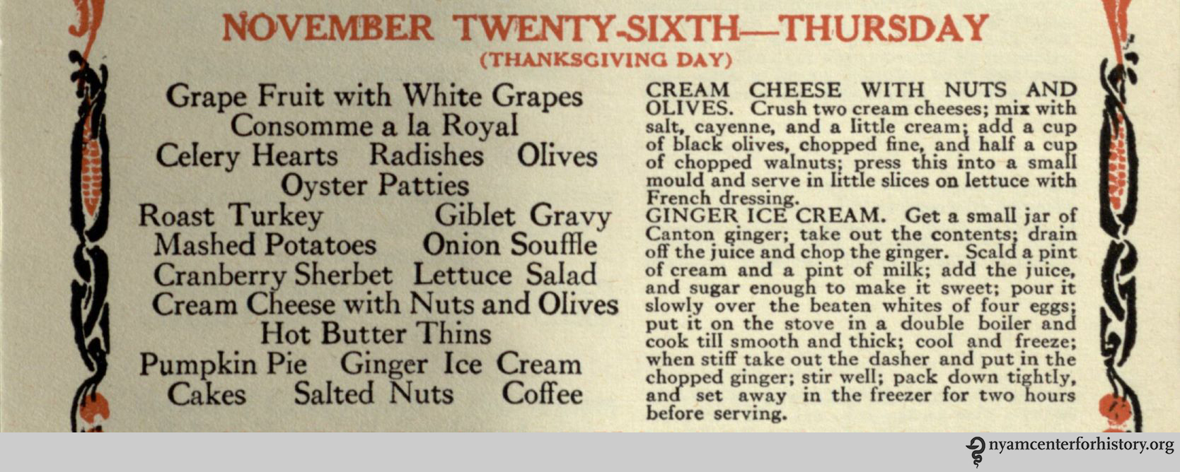 Teetshorn_CalendarOfDinners_1913_November26 Published November 13, 2015 at 1668 × 668 in Thanksgiving, 1914 Style November 26, Thanksgiving Day