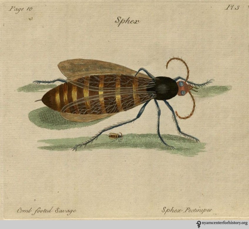 Hill_Comb Footed Savage_watermark Published June 19, 2014 at 1183 × 1088 in A Gallery of Gauzy Wings (Item of the Month) Plate 3, Sphex pectinipes, the comb footed savage. Click to enlarge.