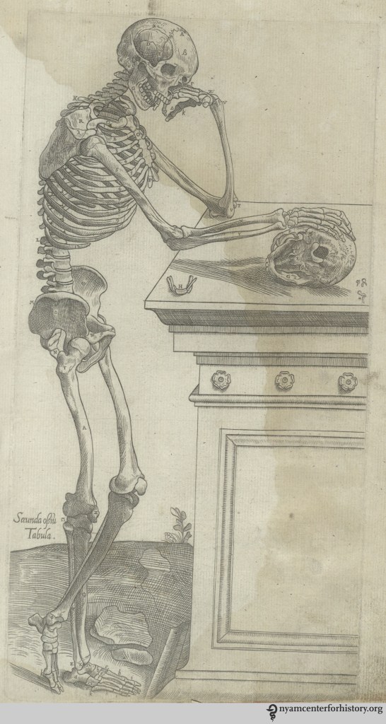 Geminus’ Compendiosa totius anatomie delineatio includes copies of many of Vesalius’ illustrations with simplified landscapes, including the one seen here. The Compendiosa was intended as a text for British physicians to use as guidance when dissecting corpses of criminals, a practice legalized by King Henry VIII in 1540. The first edition of the book, published in Latin in 1545, gives Vesalius an acknowledgement, but the two English versions that followed—including the 1559 edition, from which this image comes—do not.