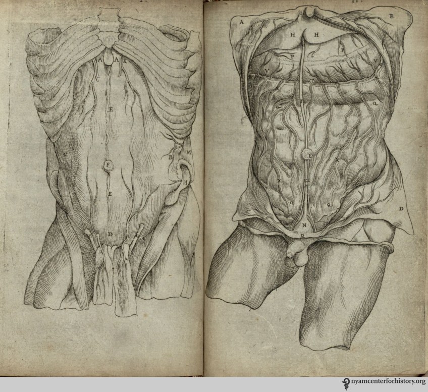 The byrth of mankind is an English translation of Eucharius Rösslin’s Rosegarten, an obstetrical text first published in German in 1513. Widely read and translated, the Rosegarten was written for midwives and contains the earliest obstetrical woodcuts. The first English edition, based on a Latin translation, appeared in 1540. The second English edition was revised by the physician Thomas Raynalde in 1545. Raynalde incorporated the work of other authors, including illustrations and descriptions from Vesalius’ Fabrica, such as these torsos.