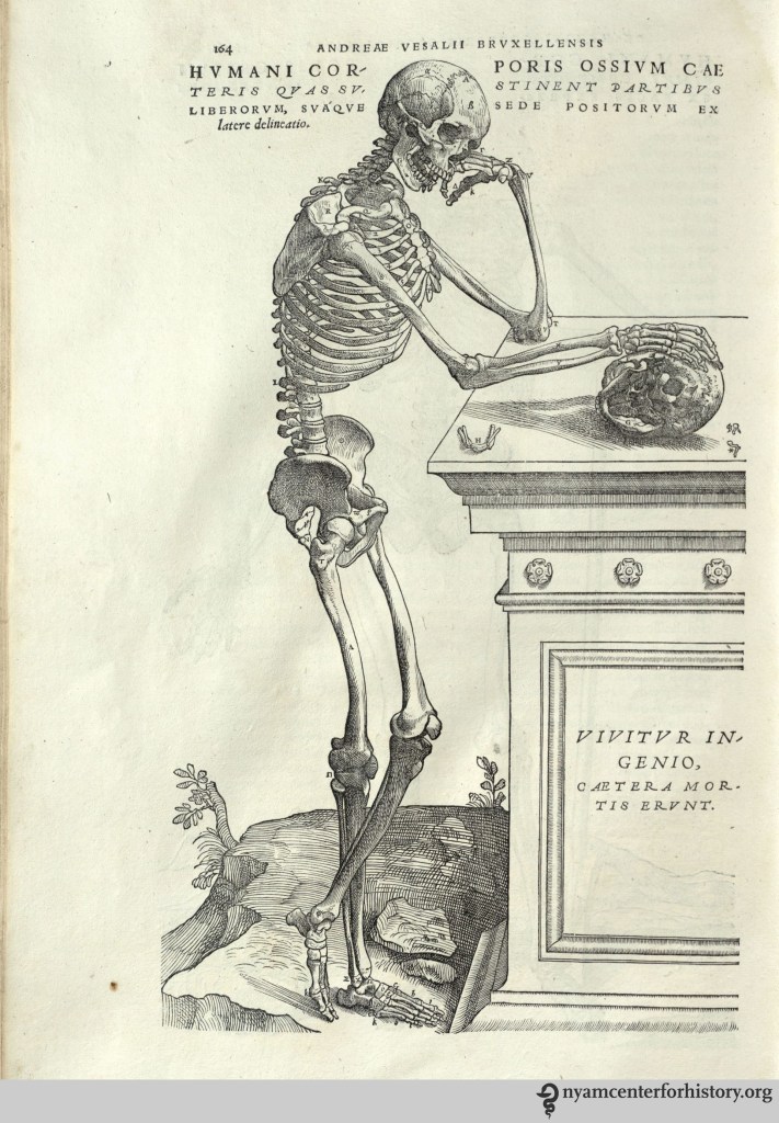The volume includes over 200 images, depicting the smallest bones up to full figure views of human skeletons and musculature. In this skeletal figure, two ossicles of the ear, the hyoid bone, and another skull rest on the sarcophagus next to the skeleton.