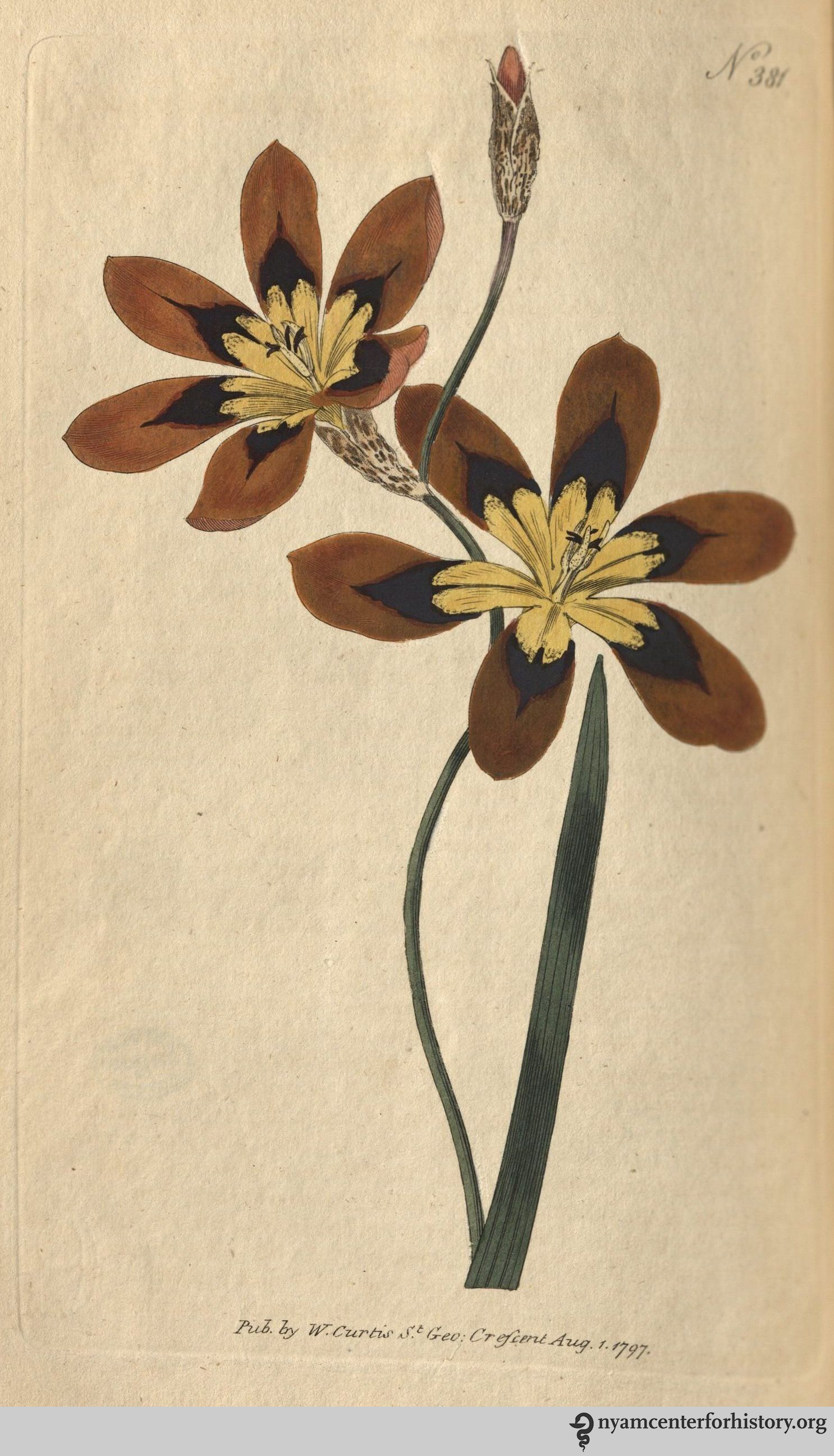 “We do not remember ever to have been so forcibly struck with the beautiful appearance of a flower, as with that of the present Ixia, nor do we recollect any one that can boast colours at once so various, so brilliant, and so pleasing; placed by the side of the Amaryllis formosissima, sarniensis, villata, Cistus formosus, Pelargonium tricolor, or a hundred other plants of the more beautiful sorts, the eye would be fixed by this alone.” (Three-Coloured Ixia, plate 381, volume 11, 1797)
