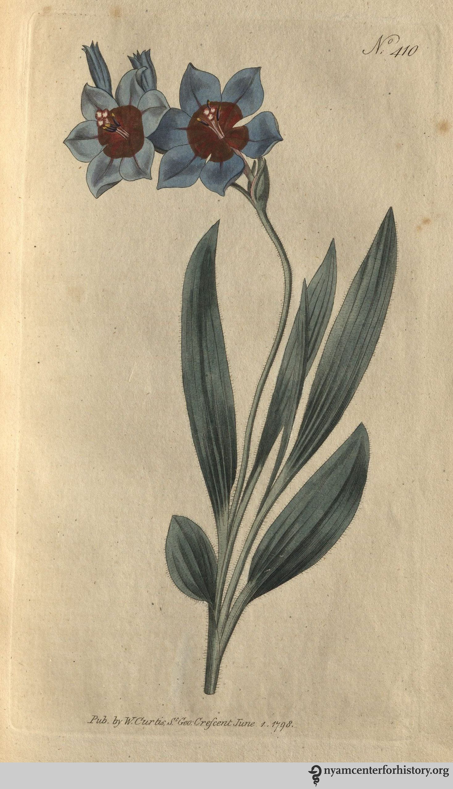 “The Ixia here represented was drawn last Summer from a specimen unusually fine, which flowered with Mr. Colvili, Nurseryman, King’s-Road, May 24, 1797; it appears to be a very distinct species, not less distinguished for the singularity than the brilliancy of its colours, and is one of those recently imported from the Cape by way of Holland.” (Red-Blue Ixia, plate 410, volume 12, 1798)