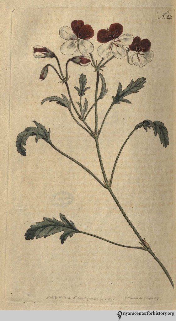 “The Pelargonium tricolor, a species perfectly new, in point of beauty is thought to eclipse all that have hitherto been introduced to this country; its blossoms are certainly the most shewy, in a collection of plants they are the first to attract the eye, the two uppermost petals are of a beautiful red, having their bases nearly black, the three lowermost are white, hence its name of tricolor . . .” (Three-Coloured Crane’s-Bill, plate 240, volume 7, 1794)