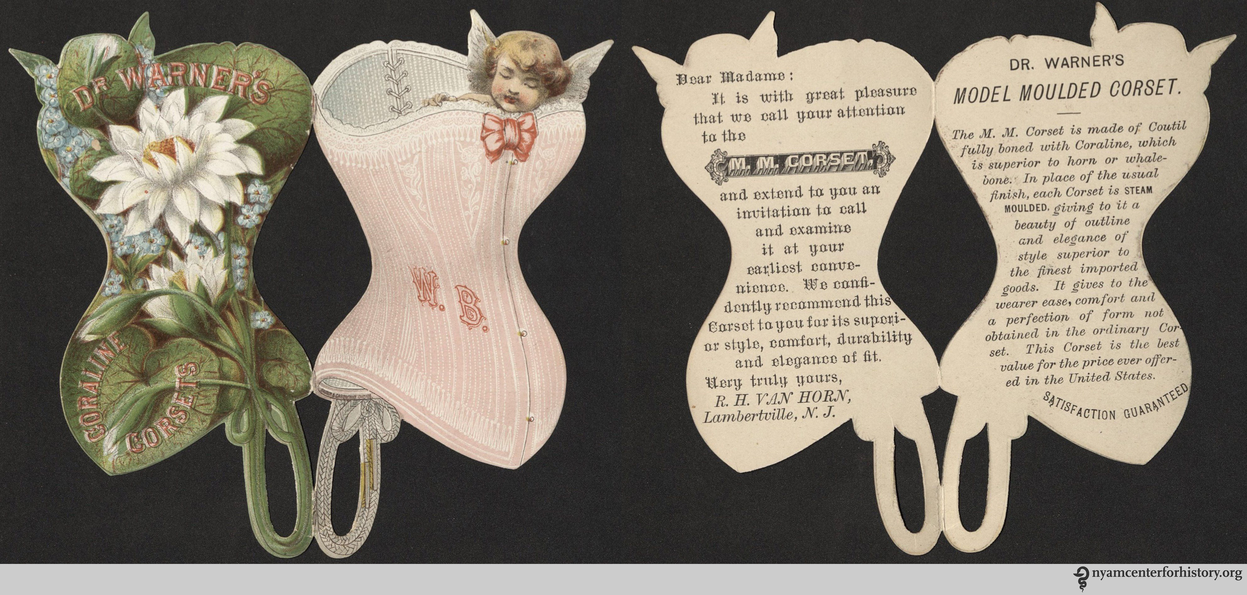 Dr. Warner trade card, inside and out. An 1883 article from Godey’s Lady’s Book and Magazine hailed Dr. Warner’s Coraline Corset as a model of comfort, superior to whalebone and horn corsets, and endorsed the model as a substitute for tight-laced models: “They have demonstrated that tight lacing is not essential to grace or beauty of form; and while impractical dress reformers have been preaching reforms which no one would adopt, Warner Brothers, by introducing properly fitting corsets, have given practical aid to the health and comfort of several million ladies.”8 Click to enlarge.