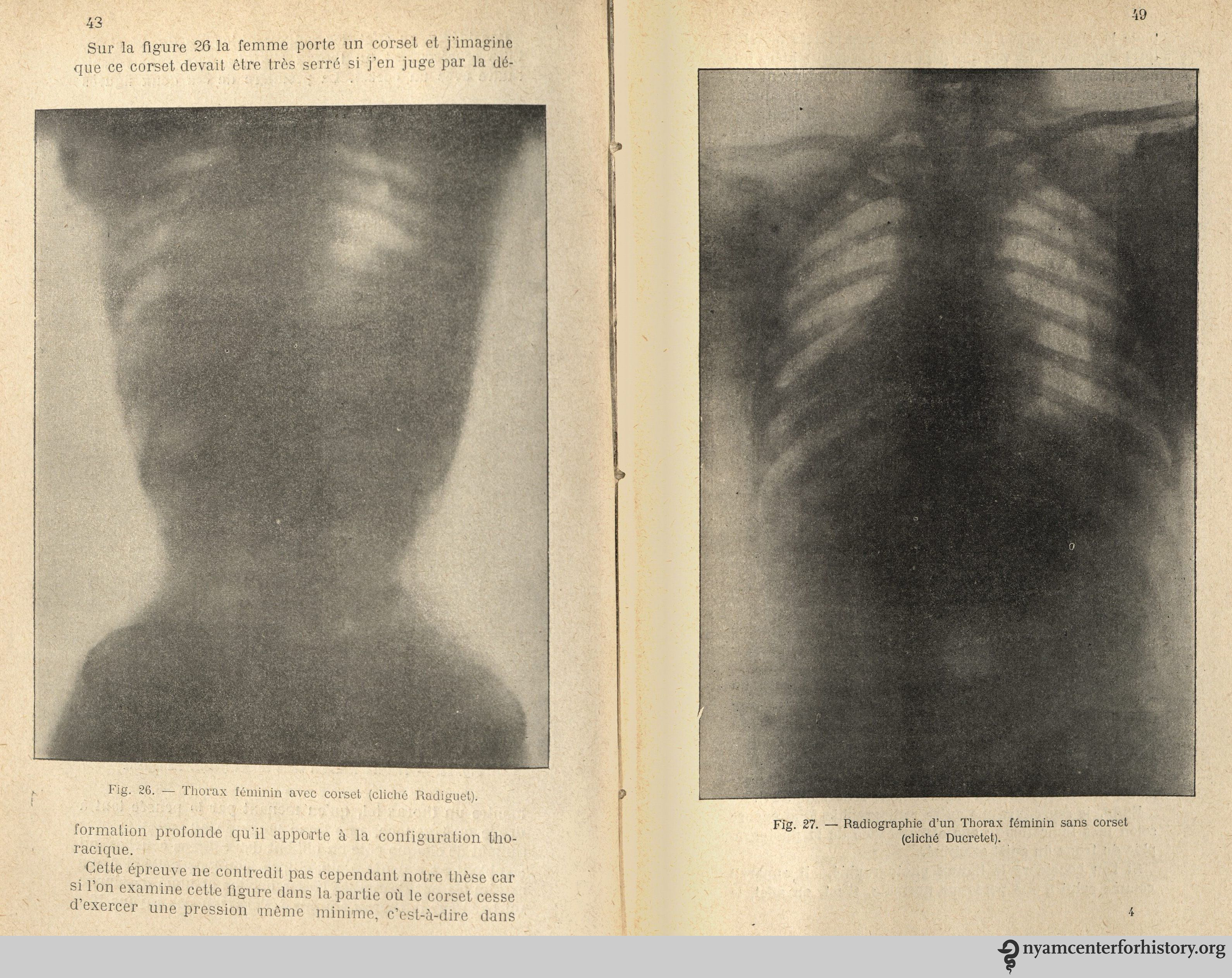 O’Followell_LeCorset-v2_1908_48-49_watermark Published May 27, 2015 at 3180 × 2525 in Did Corsets Harm Women’s Health? Fig. 26: Female torso with corset. Fig 27: X-ray of a female torso without a corset. In O’Followell, Le Corset, vol. 2, 1908.