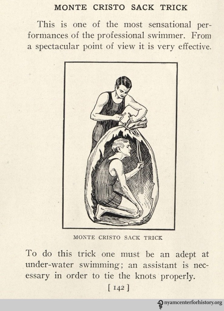 Dalton_SwimmingScientificallyTaught_1918_montecristosacktrickp142_watermark Published June 29, 2015 at 1212 × 1681 in Swimming from 1818 to 1918 The Monte Cristo Sack Trick. Dalton, Swimming Scientifically Taught, 1918, p. 142.