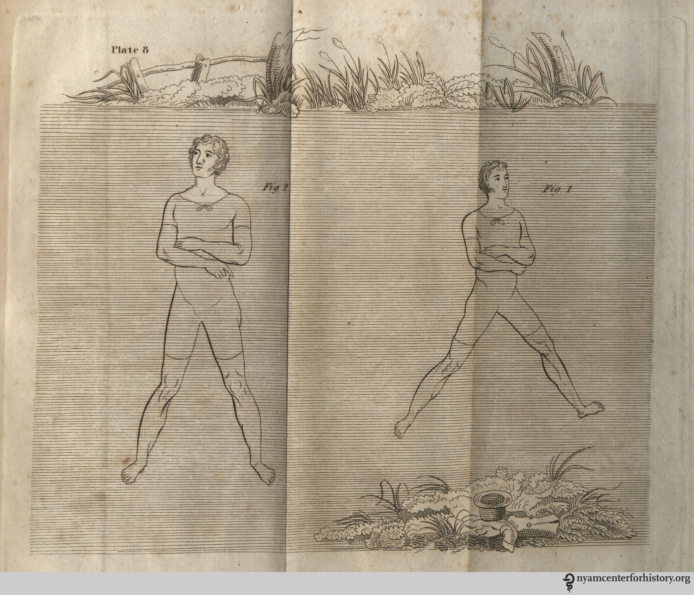 Plate 8, The Art of Swimming: Treading water. “Having…chosen a place where the water will reach up to the neck, the arms should be folded across, below the breast [figs. 1 and 2], and the legs must be exercised as in front swimming, with a difference only in time and space.”