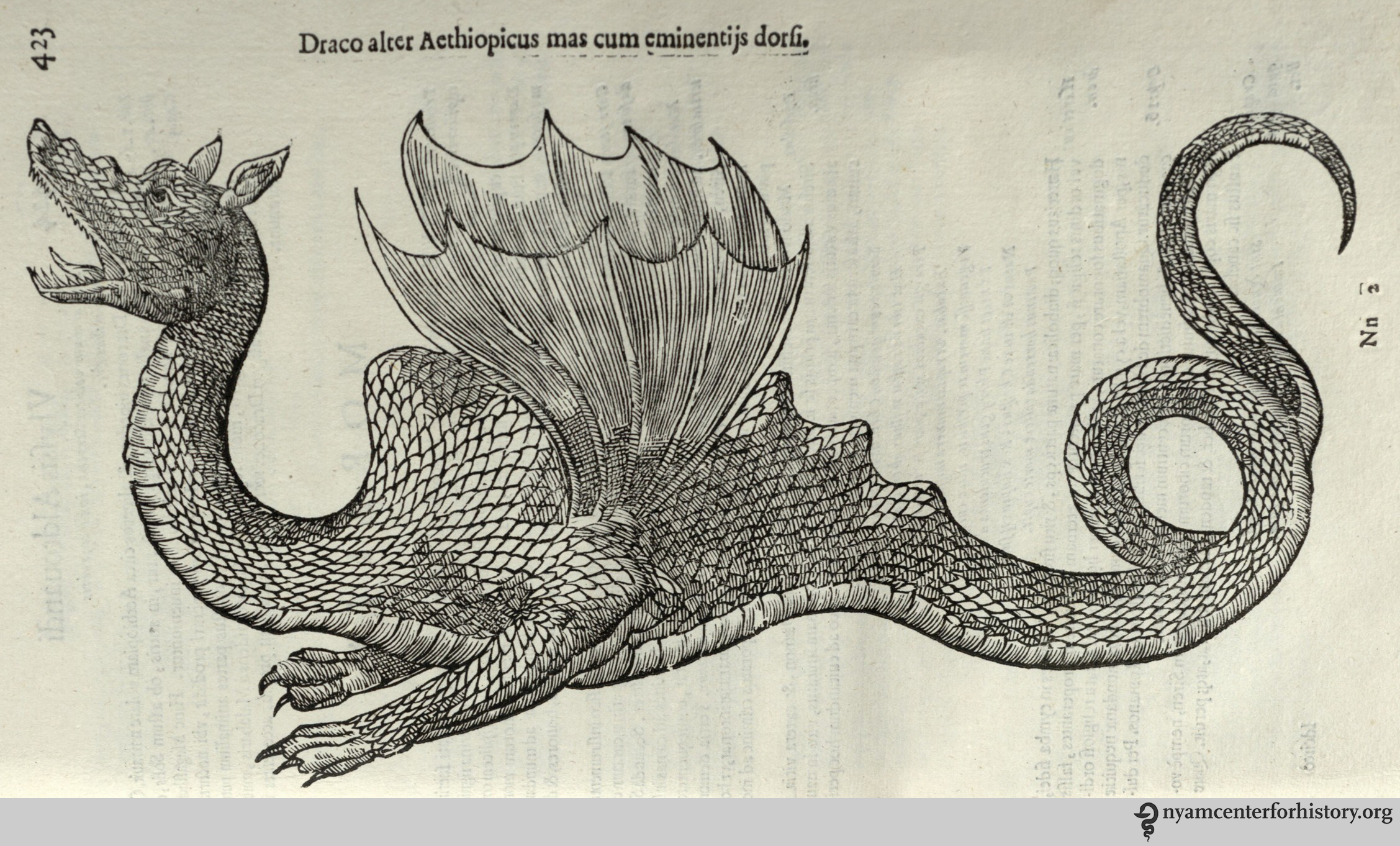 Aldrovandi_1640_p423_watermark Published October 16, 2015 at 2255 × 1362 in Merman or Mandrake? Costume Ideas From Our Collection According to the Latin caption, this is an Ethiopian dragon with remarkable feathers. From Aldrovandi’s Serpentum et draconum (1640). Read more.