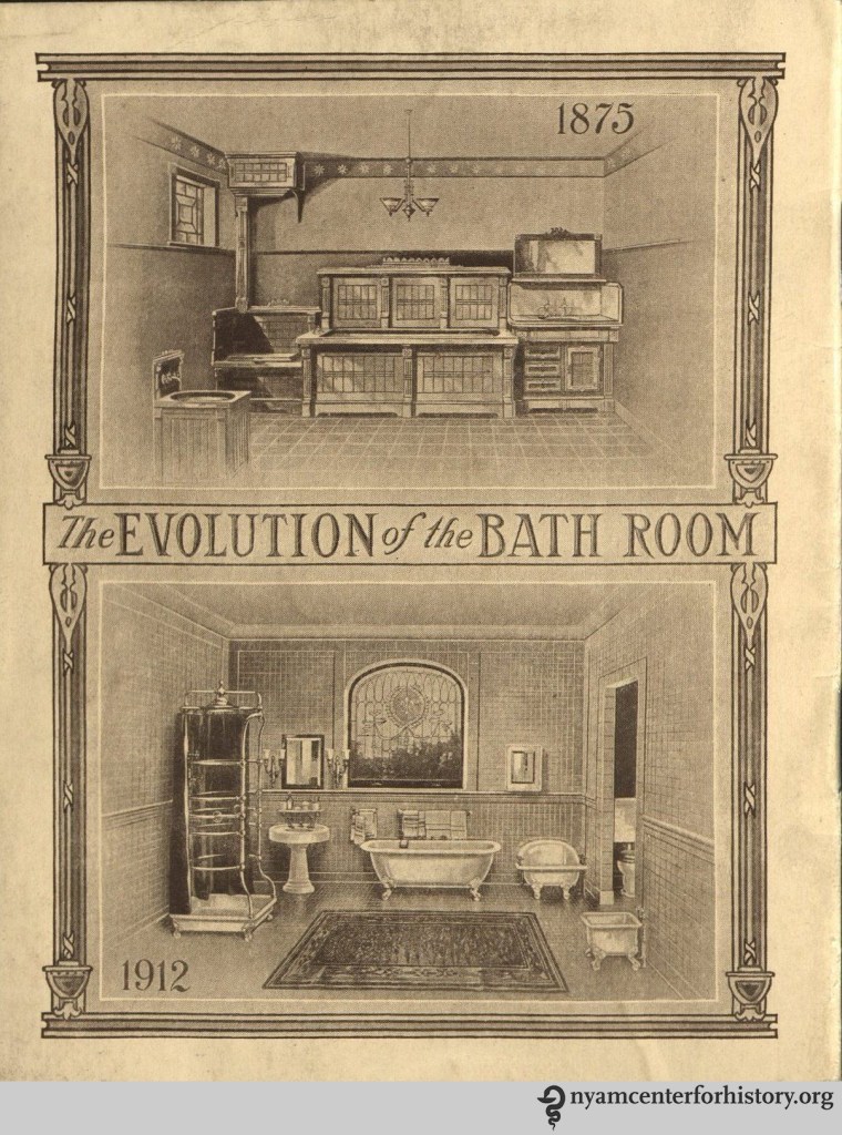 StandardSanitaryMfg_TheEvolutionOfTheBathroom_c1912_backcover_watermark Published November 17, 2015 at 1206 × 1625 in The Evolution of the Bath Room Back cover, The Evolution of the Bath Room, circa 1912. Cover, The Evolution of the Bath Room, circa 1912. The 1870s-style bathroom is shown on top. The 1912-era bathroom is on the bottom.