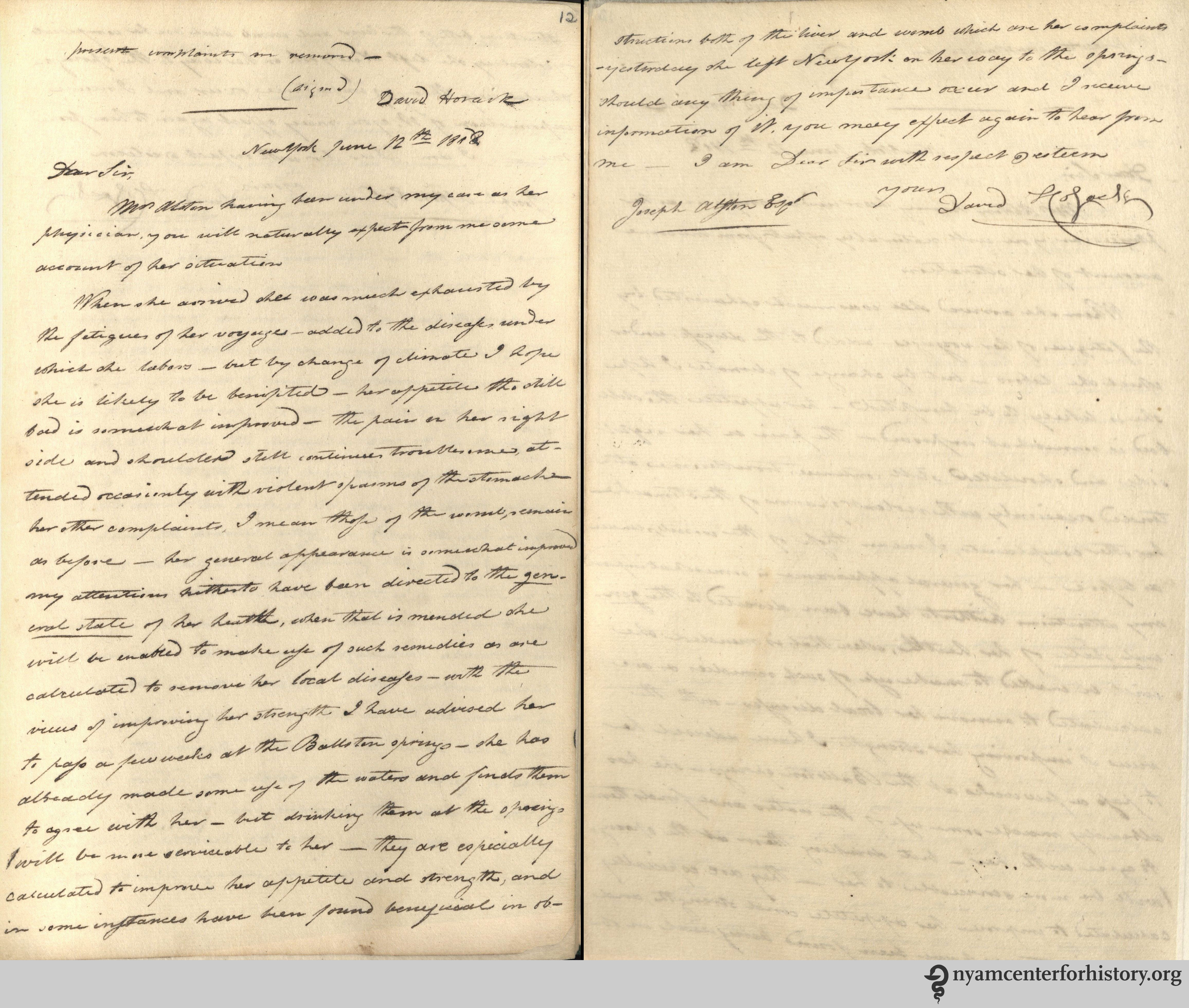 Hosack’s letter to Joseph Alston from June 12, 1808 begins: “Mrs. Alston having been under my care as her physician, you will naturally expect from me some account of her situation.” Theodosia had recently traveled to New York, and text that follows describes the effect of her journey on her health: