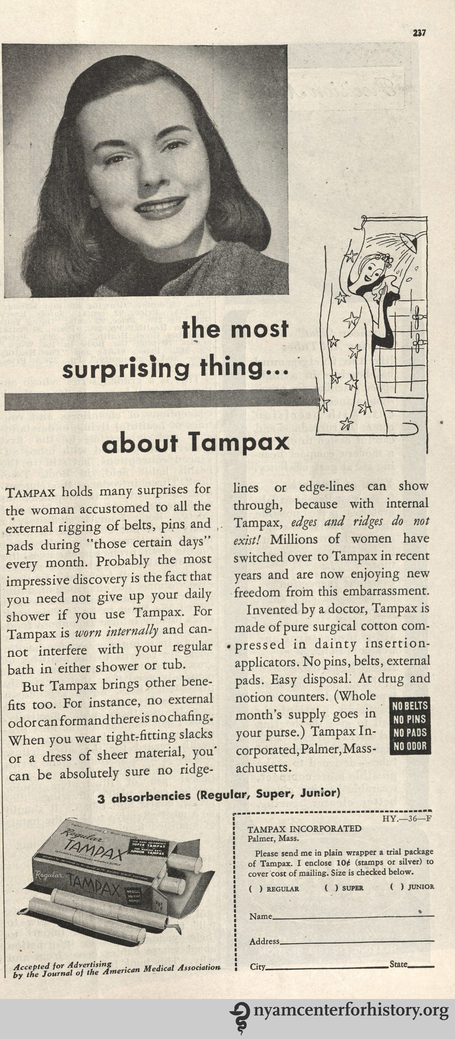 Tampax_Hygeia_March1946_watermark Published March 2, 2016 at 1468 × 3349 in “Solving Woman’s Oldest Hygienic Problem in a New Way”: A History of Period Products Tampax ad in Hygeia Magazine, March 1946. Click to enlarge.