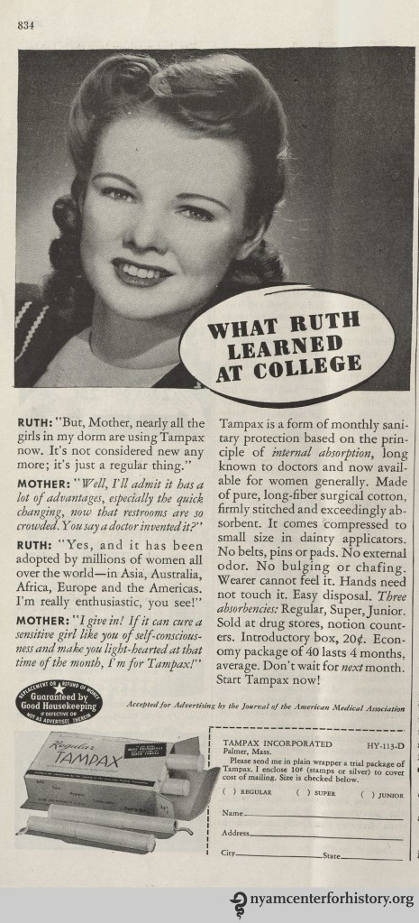 Tampax_Hygeia_Nov1943_watermark Published March 2, 2016 at 1472 × 3239 in “Solving Woman’s Oldest Hygienic Problem in a New Way”: A History of Period Products Tampax ad in Hygeia Magazine, November 1943. Click to enlarge.