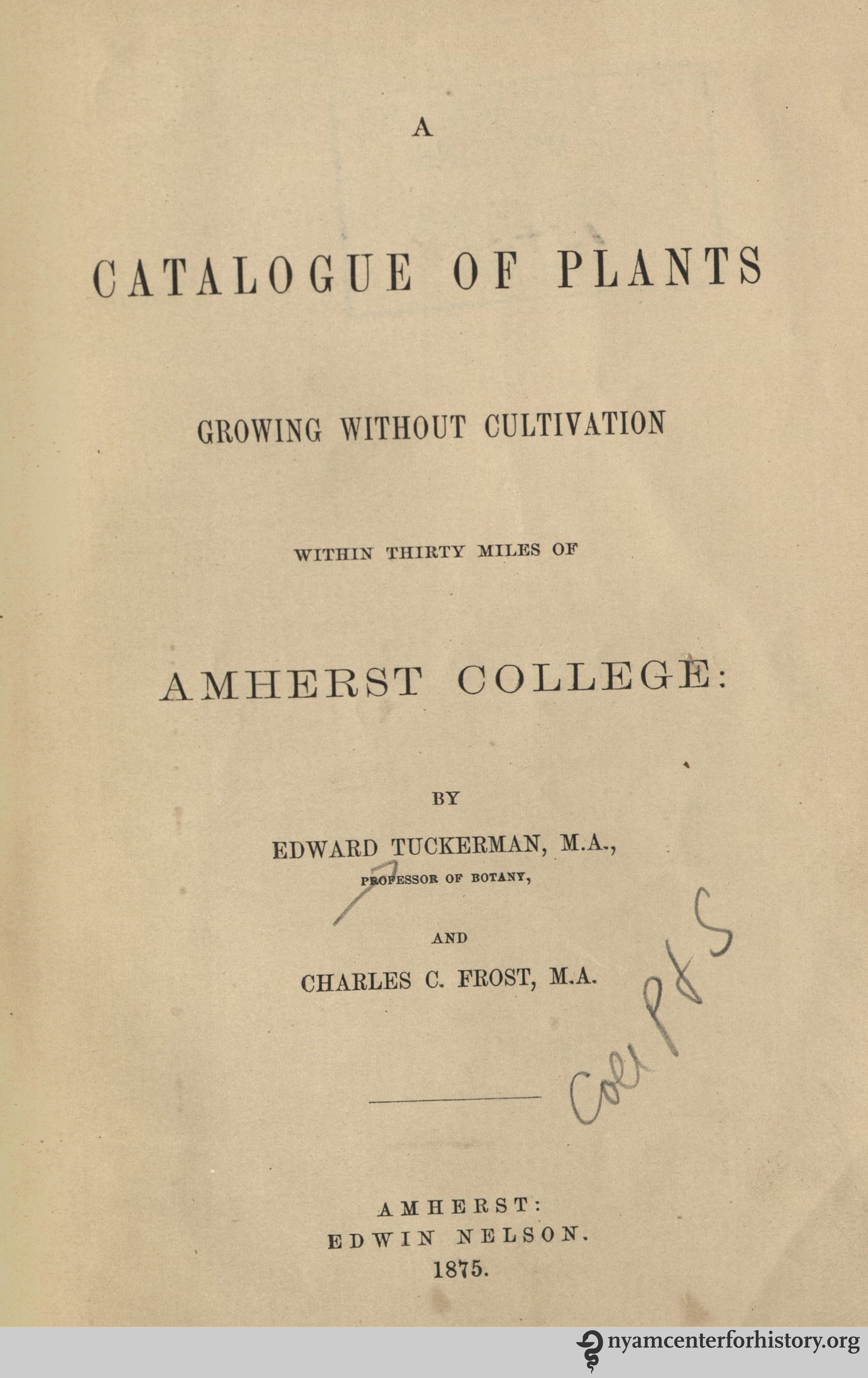 Title page of Tuckerman and Frost’s A Catalogue of Plants, 1875.