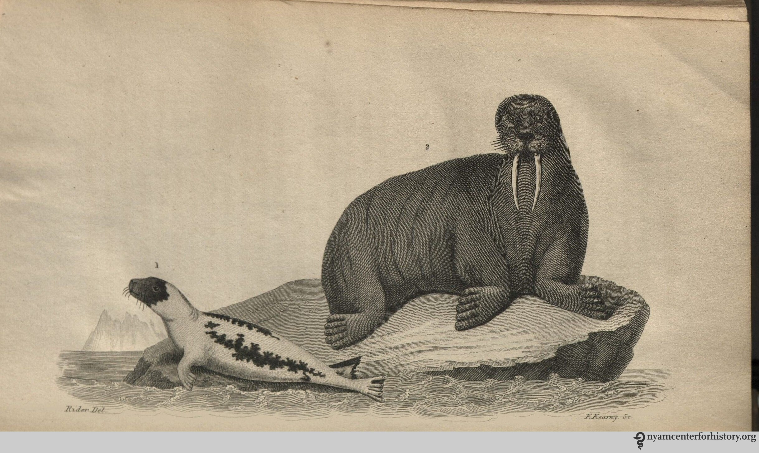 Harp seal and walrus in Volume I of Godman’s American Natural History, 1826-1828. Click to enlarge.