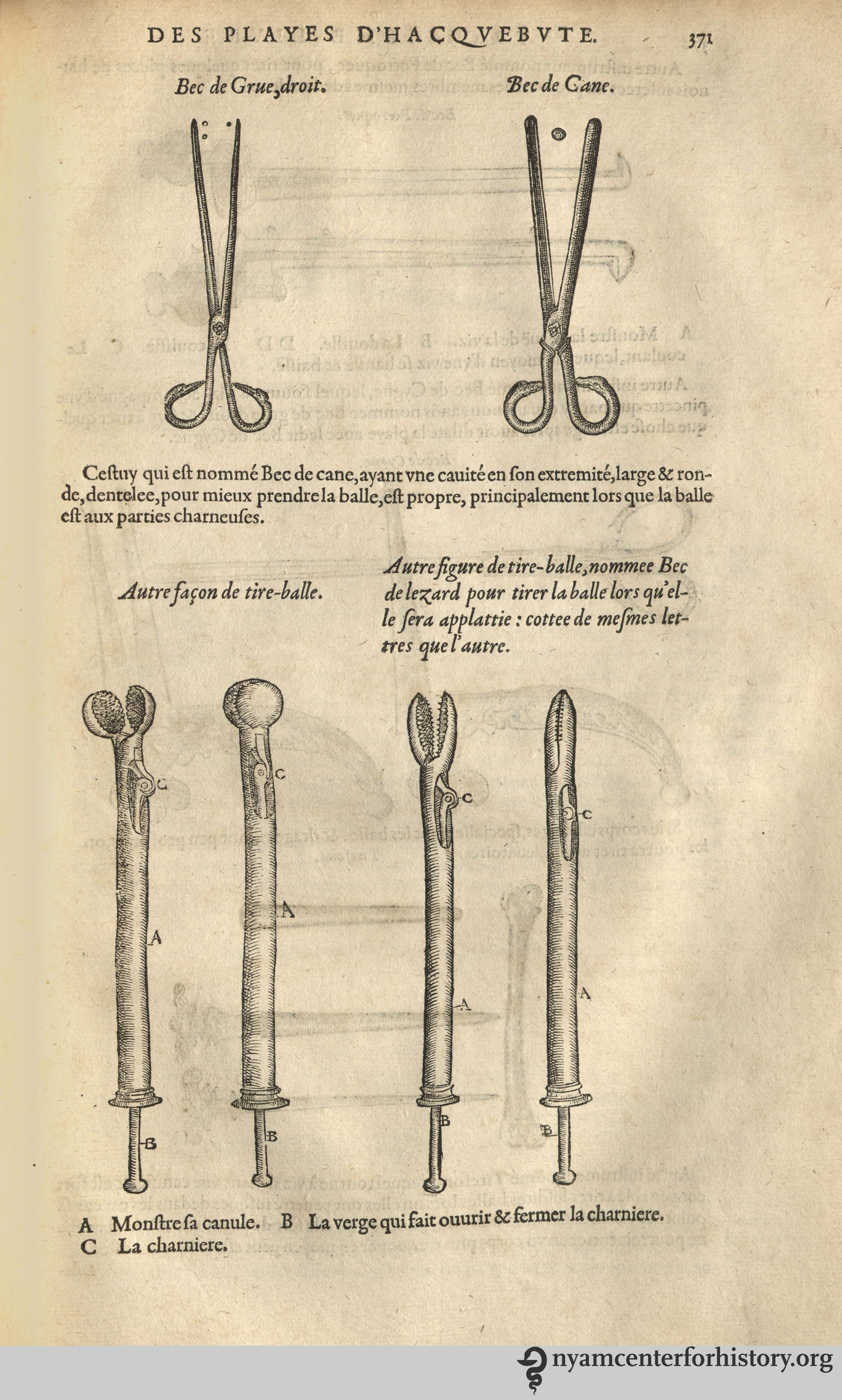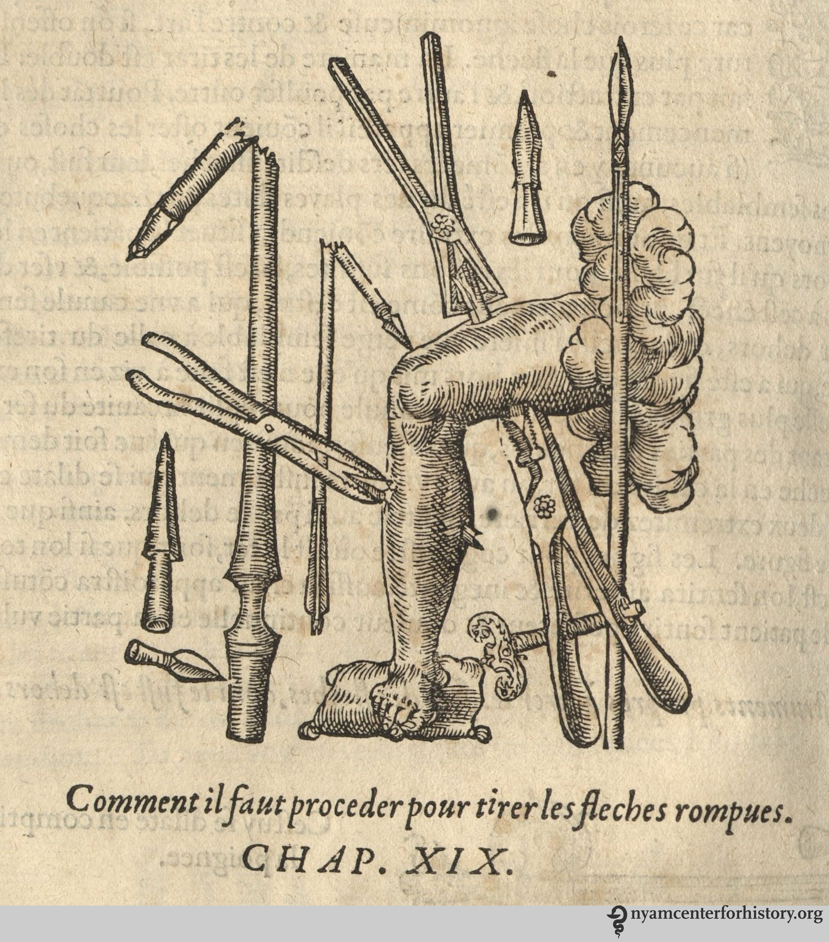 Much of Paré’s renown was based on his early work in the military context. Throughout the Oeuvres, he returns to examples of treating soldiers wounded during conflict. Perhaps the most famous vignette describes how, during his first campaign in 1536, Paré found that he had insufficient boiling oil to use in cauterizing gunshot wounds, and instead used a liniment made of egg yolk, rose oil, and turpentine. The following day, he discovered that those soldiers treated with the liniment were in a better condition than those whose wounds had been treated according to the prescribed manner. He subsequently argued for the treatment of gunshot wounds with liniments and bandaging, as well as removing affected tissue from the wound.iv