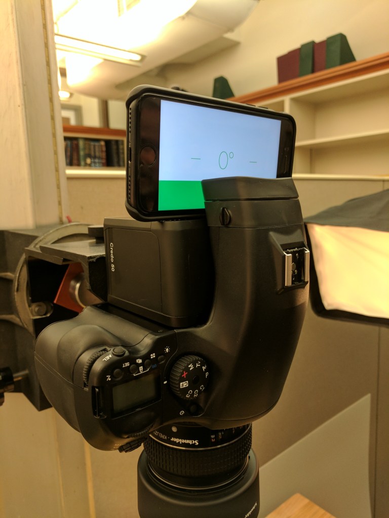 digitallab_CameraLevel Published May 24, 2017 at 3036 × 4048 in Let’s Digitize! Building the Library’s Digital Lab Leveling the camera on copy stand using iphone app.