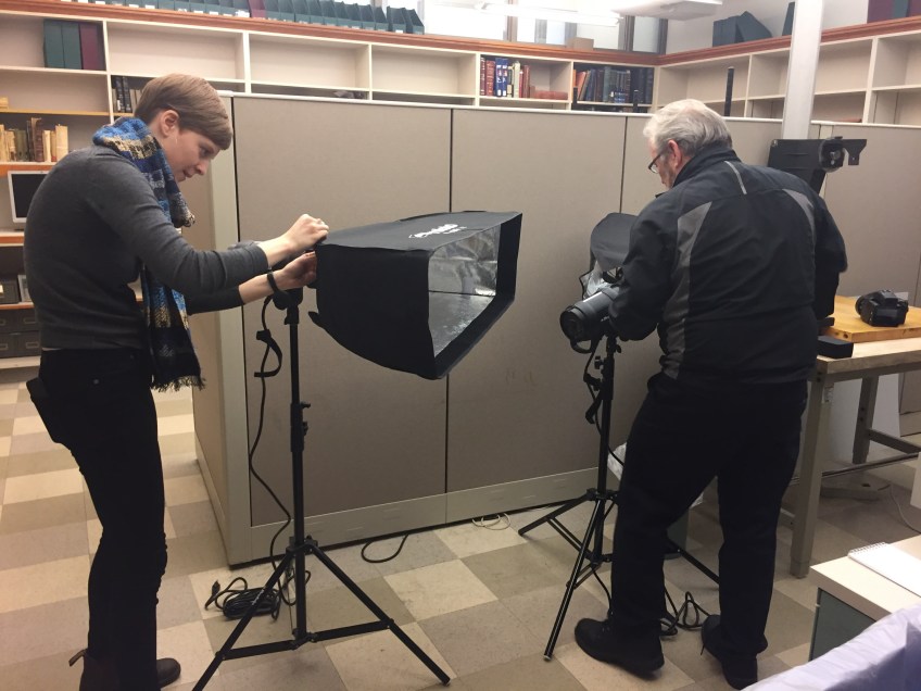 digitallab_LightSetup Published May 24, 2017 at 3264 × 2448 in Let’s Digitize! Building the Library’s Digital Lab Audrey Lorberfeld (Library) & Wayne Cozzolino (Digital Transitions) setting up lights.
