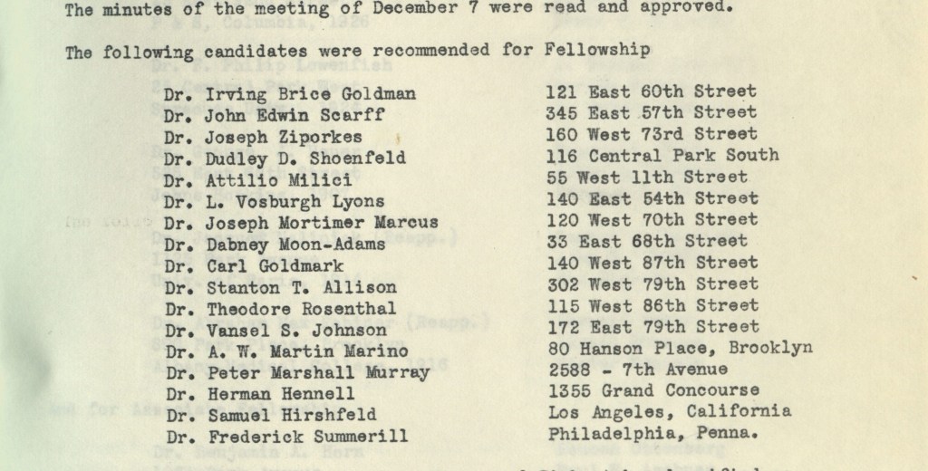 [2] Louis T. Wright was, in fact, recommended for NYAM fellowship in 1928. After a challenge, the recommendation went through on October 1, 1930, but at the November 6, 1930, stated meeting the Fellows declined to elect him.