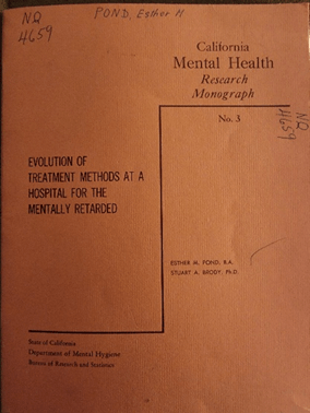 In 1965, two researchers working for California’s Department of Mental Hygiene, Esther Pond and Stuart Brody, produced a report called “Evolution of Treatment Methods of a Hospital for the Mentally Retarded.” Focused on what was then-called the Sonoma State Hospital in Sonoma County, California, the state’s oldest institution for the developmentally disabled, this report was officially California Mental Health Research Monograph no. 3.[3] It was prepared specifically for use by the Department, printed on cheap paper, given only a pink paper cover, and was likely expected to be, eventually, discarded. The Department certainly could not have anticipated that it would still exist, more than fifty years later, tucked away in a filing cabinet in the New York Academy of Medicine Library.