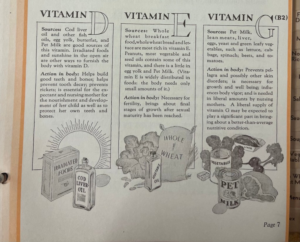 The cookbook is a masterpiece of marketing and nutrition. Each recipe inside specifically calls for Pet Milk. This was done not only because they put out the recipe book, they assure you, but because their product is unlike other kinds of milk, including “ordinary whole” milk. With milk being “one of the most important of all our items of food,” or even “the most nearly perfect food,” you want to be sure you are choosing the right kind! The vitamins contained in a serving of Pet Milk span the alphabet. This isn’t the case with any other milk, they claimed. The company speaks of the importance of “irradiated” milk: using ultra-violet rays to provide an extra dose of Vitamin D.