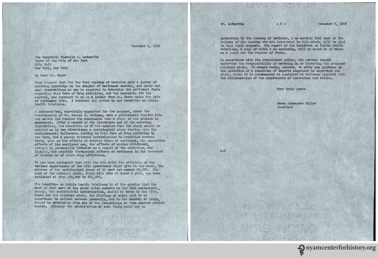 In 1938, at the request of Mayor Fiorello LaGuardia, The New York Academy of Medicine’s Committee on Public Health Relations formed a subcommittee to study marijuana use in New York City. As you can see in this letter to Mayor LaGuardia from the Academy’s president, James Alexander Miller, M.D., the subcommittee determined a more extensive study was necessary. They recommended two approaches, a sociological study of marijuana use in the city and a clinical investigation of its physiological and psychological effects. (Click to enlarge.)