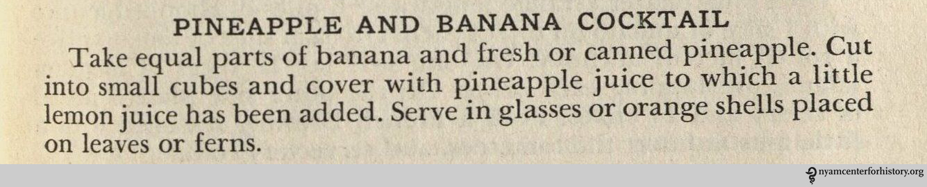 This inset from “Bananas…How to Serve Them” (1941) illustrates the health benefits of bananas at every age. We learn that the Dionne quintuplets (b. 1934), the earliest quints to survive their infancy, ate bananas. Bananas are a “training table favorite” for athletes, and they appeal to the elderly as well because they are easy to chew and digest.