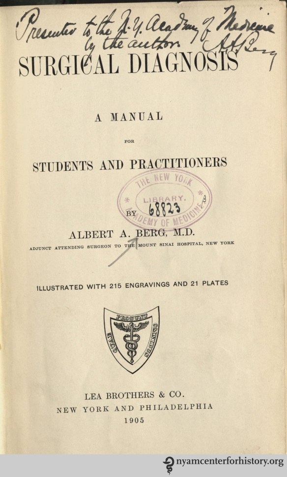 Title page of Alfred A. Berg’s Surgical Diagnosis, 1905, given by the author to the New York Academy of Medicine Library.