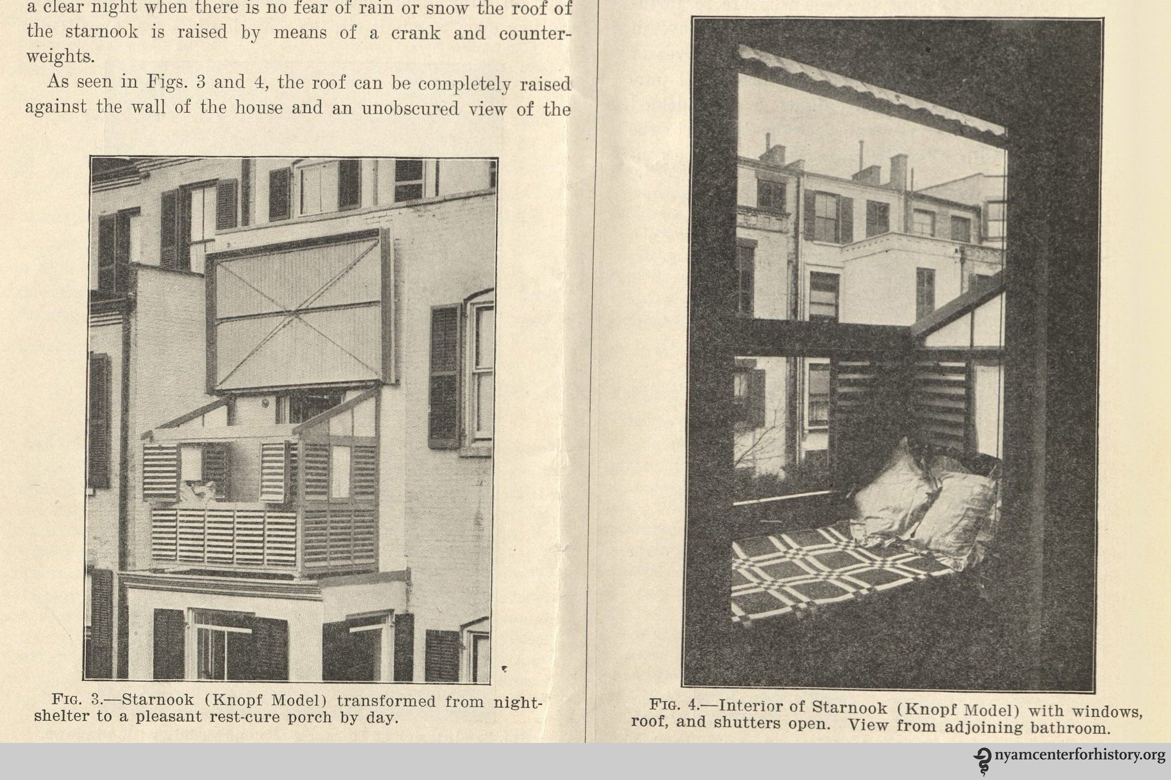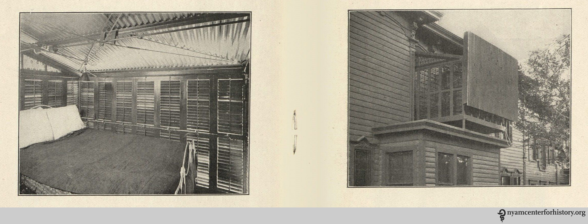 “In presenting this new device to the profession and the public, the inventors trust to have been in a measure helpful not only in solving the problem of outdoor sleeping and outdoor resting for the tuberculous in cities, but also to have given opportunity to other sufferers to recuperate, and to the well and strong to enjoy constant fresh air, at least at night, and enable them to be more frequently in touch with nature than is granted to most city dwellers.”4